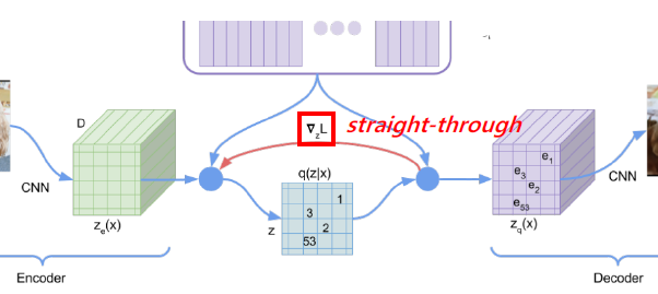 이것도 코드북의 값을 매핑시키는 과정을 미분할 수 없는 문제가 생긴다. 여기에서는 straight-through라는 기법으로 문제를 해결한다. 디코더의 gradient를 인코더에 사용하여 업데이트를 하겠다는 것이다. 이게 어떻게 유의미한 결과를 가져오는지 이해는 못했지만, Ze와 Zq의 사이즈가 같아 가능하다고 논문에서는 말한다.