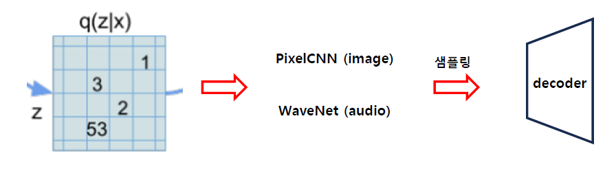 이미지의 경우 PixelCNN, 오디오의 경우 WaveNet을 이용하여 분포를 학습한 후, 해당 분포에서 샘플링된 값을 디코더에 넣어 데이터를 생성한다. 이것이 vq-vae가 데이터를 generate하는 과정이다.