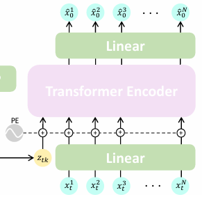 토큰 z와 t 시점에서의 시퀀스를 받아 transformer encoder를 거쳐 signal를 예측하게 된다. 전체적인 구조는 복잡하다고 생각되지 않는다.