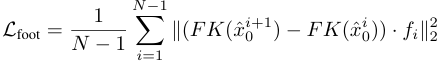 Lfoot은 바닥과 발이 닿았는지를 다루는 loss이다. 여기서 FK는 앞선 것과 달리 identity function을 의미한다. 만약 이전 프레임에서 바닥과 닿지 않았다면 f는 0으로, 닿았다면 1로 표시한다. 이렇게 하여 프레임 간의 자연스러운 변화를 이끈다.