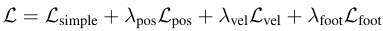 loss는 총 4개의 항으로 이루어져있다. 각 loss를 자세히 살펴보자. 그 전에 한 가지 사실을 알고 가면 좋다. MDM의 output의 representation은 joint rotation or position이다.
