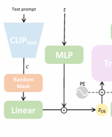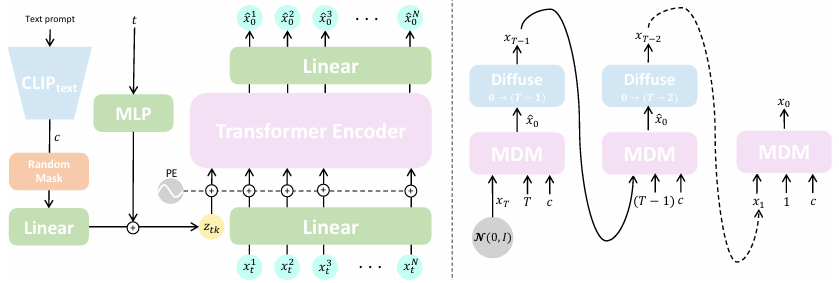 MDM 모델의 구조를 먼저 살펴보자. 먼저 Text prompt를 clip을 이용하여 임베딩하고, t (noise level)을 이용하여 토큰 z를 만든다.