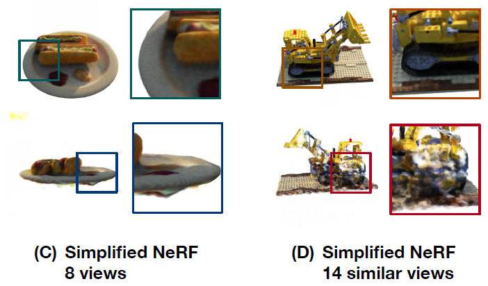 학습 pose 주변에서 렌더링한 결과 (top)를 보면 그럴 싸하지만, 다른 pose에서의 결과 (bottom)을 보면 부정확한 geometry 로 인해 artifacts가 확인된다. 근처 카메라로부터의 supervision이 없으면 불투명도 (opacity)는 random initialization에 민감하다.