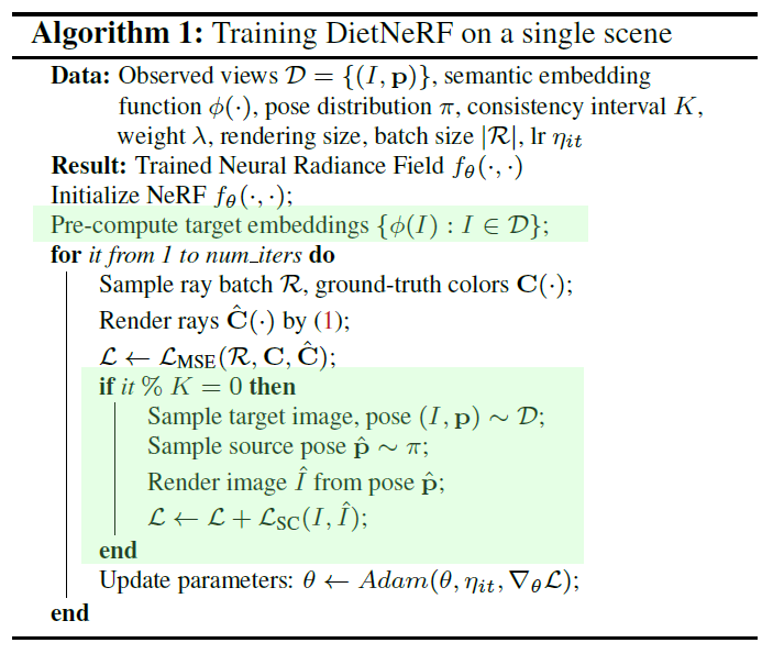 DietNeRF는 few-shot learning으로 적은 이미지로 해당 scene을 구현하는 것을 목표로 한다. 기존 NeRF는 다른 이미지로부터 prior knowledge를 얻을 수 없어 few-shot에 많은 어려움이 있다. DietNeRF는 기본 픽셀별 MSE loss에 추가로 semantic consistency loss를 도입한다. 해당 loss로 추가적인 radiance field supervise가 가능하게 된다.