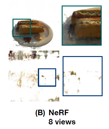 Near-fields artifacts에 대해서 조금 더 자세히 보자. 관찰된 뷰의 수가 적거나, 관찰된 뷰가 장면의 특정 부분에 집중되어 있을 때 주로 발생하는 문제이다. 물체가 가까운 거리에서 카메라가 관찰하고 있다고 하면, 각도에 영향을 많이 받게 된다. 즉, 거리가 멀면 물체의 많은 부분을 한번에 볼 수 있지만 가까이서 보면 볼 수 있는 영역이 많이 제한된다. 그래서 각도가 조금 바뀌어도 서로 다른 view에서 겹치는 부분이 적어지게 된다. 가까운 거리에서 볼 때, 생길 수 있는 문제라는 의미에서 'near-field' 가 붙지 않았을까 생각한다.